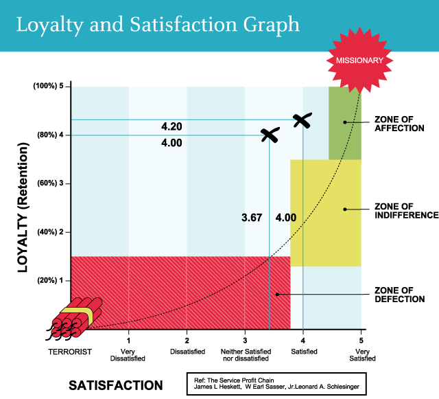 Over this  3 year time frame, measured results show how the level of Customer satisfaction and loyalty moved from the Zone of Defection towards the Zone of Affection.